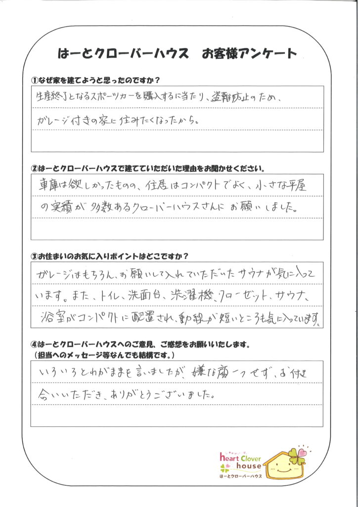 車庫は欲しかったものの、住居はコンパクトでよく、小さな平屋の実績が多数あるクローバーハウスさんにお願いしました。