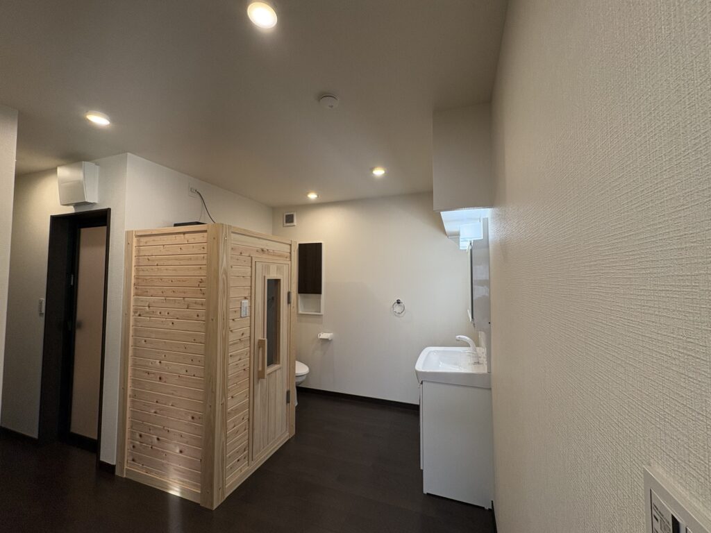 外皮性能0.46W/㎡・KとHEAT20 G2レベル/一次消費エネルギー消費量BEIは0.69。】   お客様が趣味を楽しめるようサウナと、大切にされている愛車のためにガレージも施工させていただきました。お客様の「好きなこと」がたくさん詰まったお家に仕上がりました。